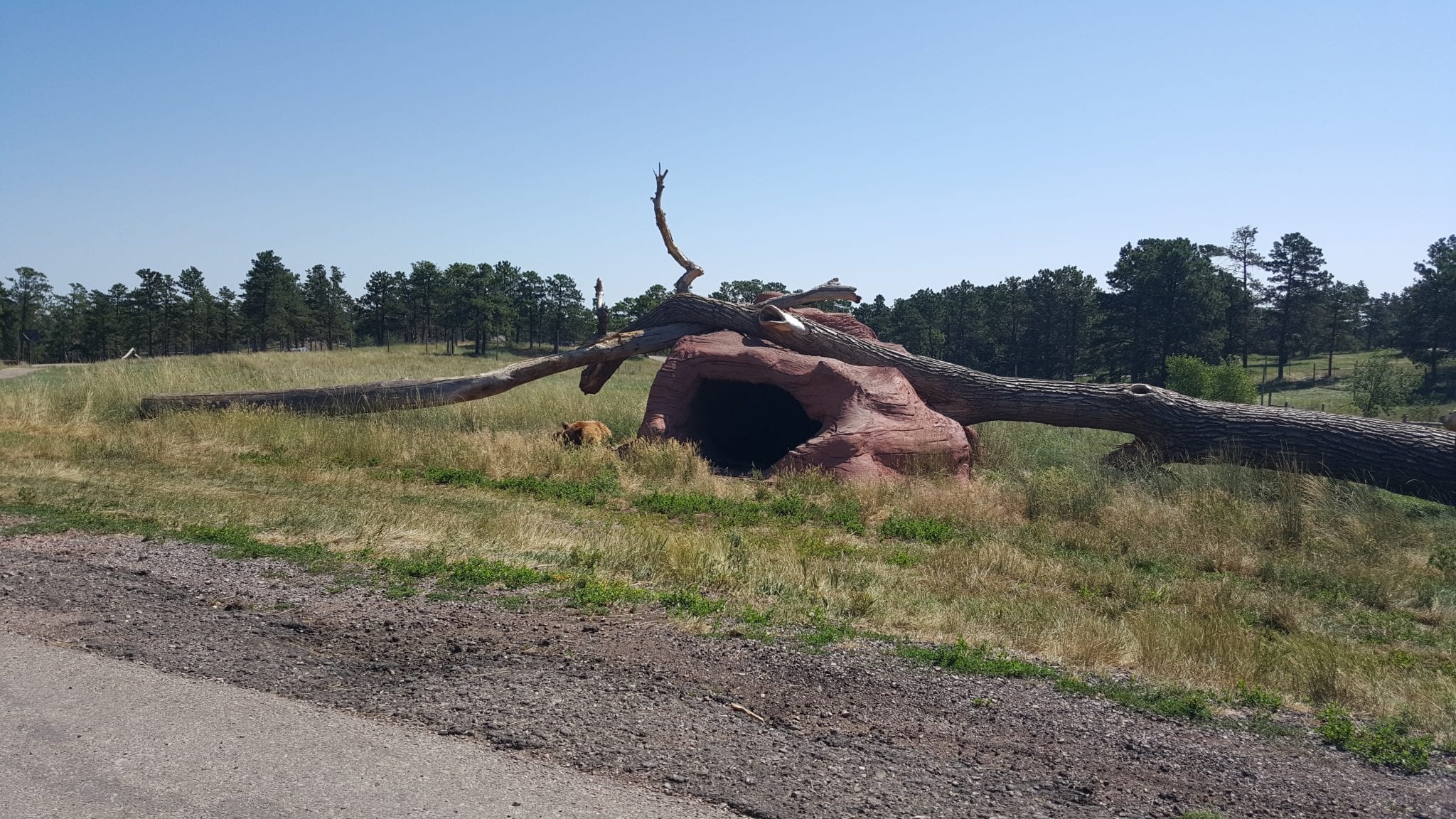 On the way I saw a sign for a place called “Bear Country.” There was several rows of cars at the gate so I said what the heck and got in line too. HA! I didn’t even have any idea as to what I was going to be doing/seeing. I finally got to the front of the line and was instructed to keep my windows up through out the drive. Yeah that didn’t happen much. Anyway, I followed a line of cars across a winding road that led from one group of animals to another. As we approached the “bear den” I saw tons of electric fence and an outpost on the horizon with a guard in it. Insert flashbacks from every Jurassic Park movie here. I knew where this was going. Thankfully, I drove through unharmed. Truthfully though, it was a waste of $16 in my opinion. I mean I was hoping to at least make it on YouTube as one of those fools that gets a giraffe head in the window of the car…. or something. On the way out you could park and go in the baby sanctuary of all the small animals. Well I had places to be so didn’t stop. I did notice LOTS of out of state vehicles parked there though. I saw license plates for Kentucky, Nebraska, Wyoming, Michigan, South Carolina, Florida, Wisconsin and Texas. Well those are the ones I remember. I’m sure a lot of these people were there for Sturgis and just happened to drive through like I did.